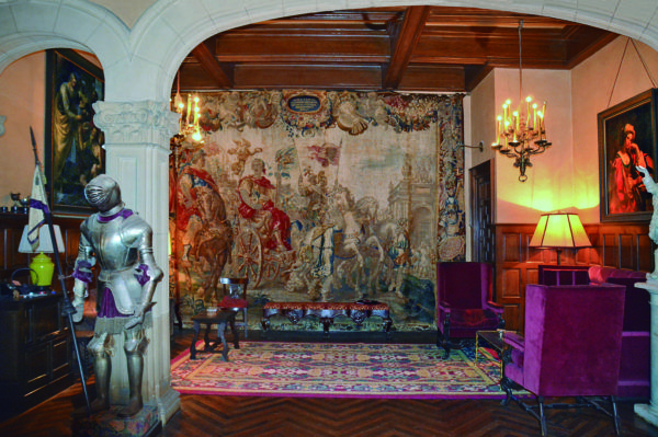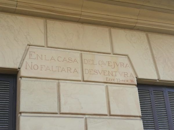 Puede leerse en la fachada la inscripción » en la casa del que jura no faltará desventura «. Atravesamos un amplio portalón con las puertas del garaje al fondo. A la derecha arranca una elegante escalera de mármol negro con un gran espejo dorado en el primer rellano. El piso principal es el residencia de 470 metros cuadrados. Hall central con decoración palaciega, un gran tapiz y chimenea, así como retratos familiares y una armadura. Un escenario aristocrático.