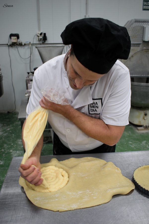 - » La Pantxineta es un hojaldre con relleno de crema, con un poquito de canela y cubierto de almendra. Esto se cuece muy poco a poco en el horno de tal manera que queda un pastel crujiente con la crema dentro fresquita y ese regusto a la almendra tostada. Yo recomiendo comerla caliente aunque no es obligatorio «