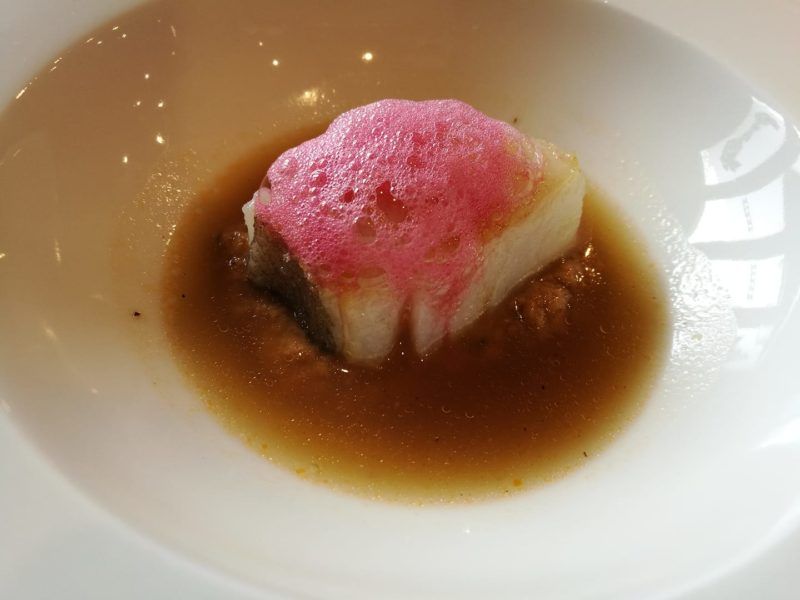 - » ha sido una apuesta atrevida. Partiendo de una receta tradicional como la zurrukutuna hicimos una base de sopa de ajo con un taco de bacalao semicrudo con un caldo de verduras y carne. Luego tiene especies como estragón, eneldo y finalmente anís rallado que le da sabor potente. Por encima un aire de remolacha que le da un toque de dulzura «