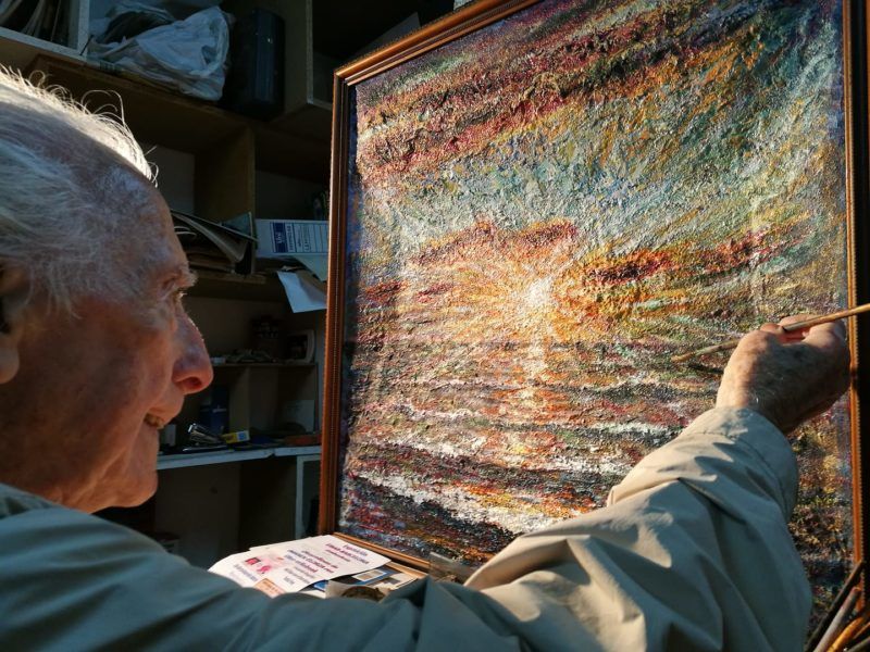 Daba gusto verle alejarse del cuadro para tomar la perspectiva y acercarse con el fino pincel para dar un trazo nuevo. Uno más de los muchos que durante toda una vida ha reflejado en esta difícil y creativa técnica del óleo relieve sobre planchas de acero que tanto éxito y fama mundial le ha dado.