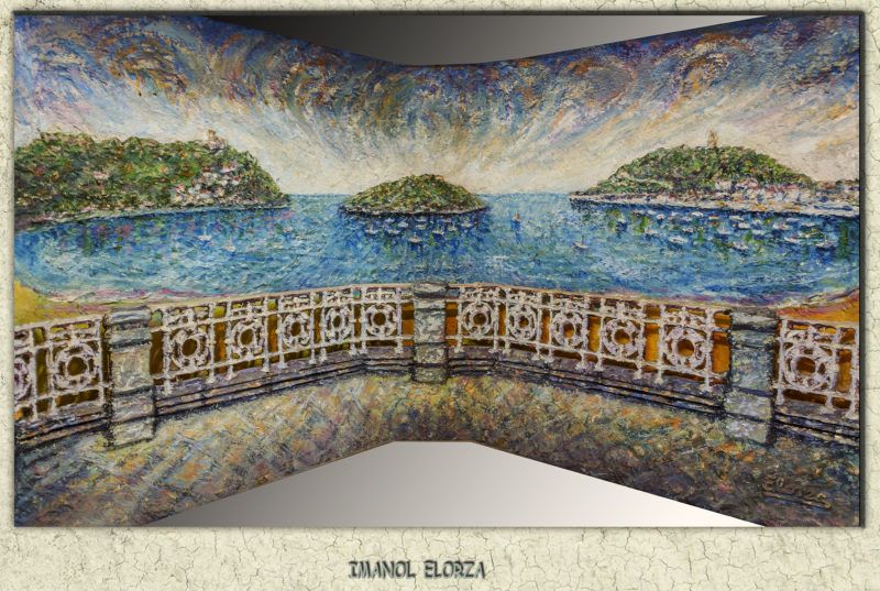 Enamorado de Donosti son también muy valoradas las obras tamaño gigante de la Catedral del Buen Pastor, Teatro Victoria Eugenia o paisajes de La Concha.