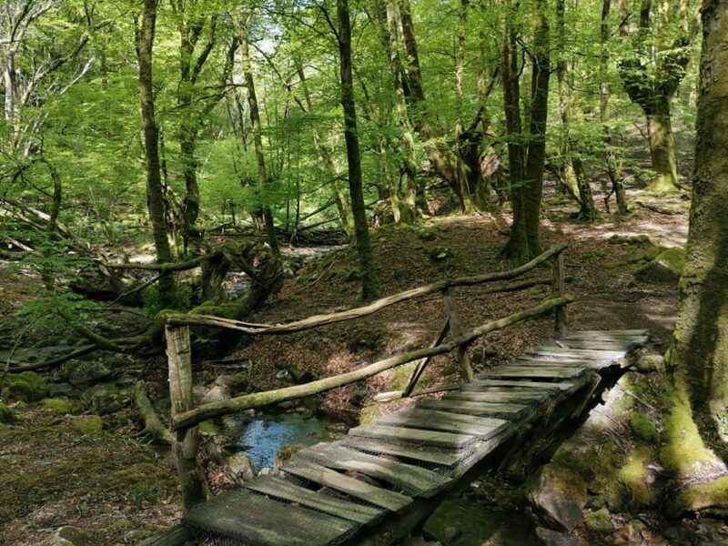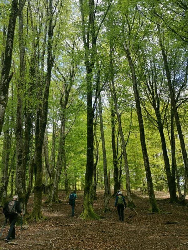 Grandes bosques de robles, hayas, castaños, abetos, alerces, coníferas y los últimos acebos. El susurro de riachuelos que acompañan el paso. Un agradable sonido de cientos de pajarillos. Como decimos en otras ocasiones, solo faltaron a la cita familias de gnomos y lamias.