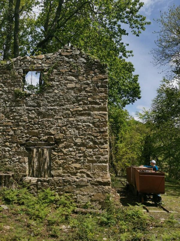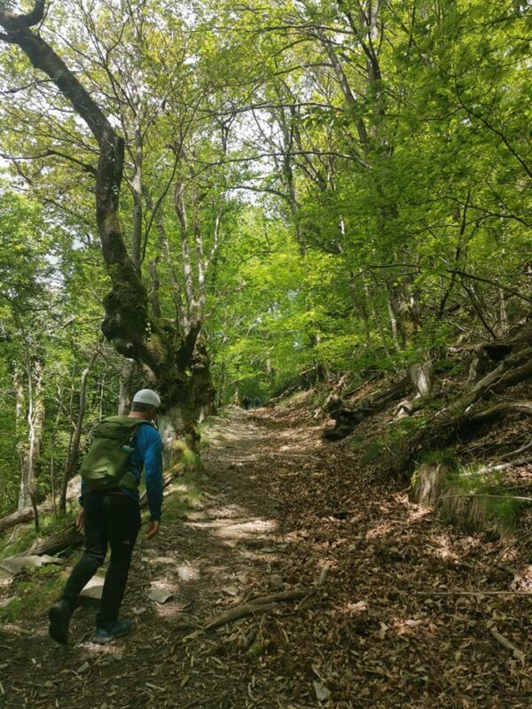 Tras unos metros por la carretera a Eskas, a la derecha nace el sendero del antiguo ferrocarril minero, marcado como PR NA 125 y sus marcas blancas y amarillas. La primera media hora es muy fuerte y salva casi todo el desnivel, sumergidos en un soberbio bosque de especies autóctonas.