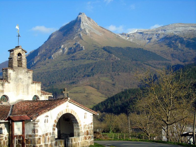 No te pierdas esta ermita. En apenas 300 metros llegaré a una zona muy pastoril donde encontraré una de las vistas más fotografiadas de nuestras montañas. La coqueta ermita de San Saturnino con la silueta ya piramidal del Txindoki como telón de fondo. Un espectáculo.