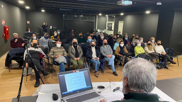 Con una buena asistencia, 65 personas presenciales entre los dos grupos (y 16 por videoconferencia), y una exquisita ventilación de la sala (<550 ppm. de CO2), la charla se ha desarrollado en un ambiente distendido que ha dado lugar a un interesante y participativo debate posterior.