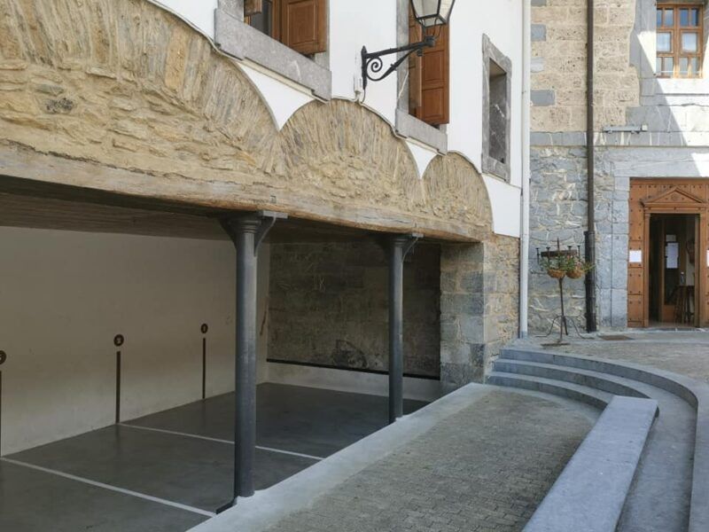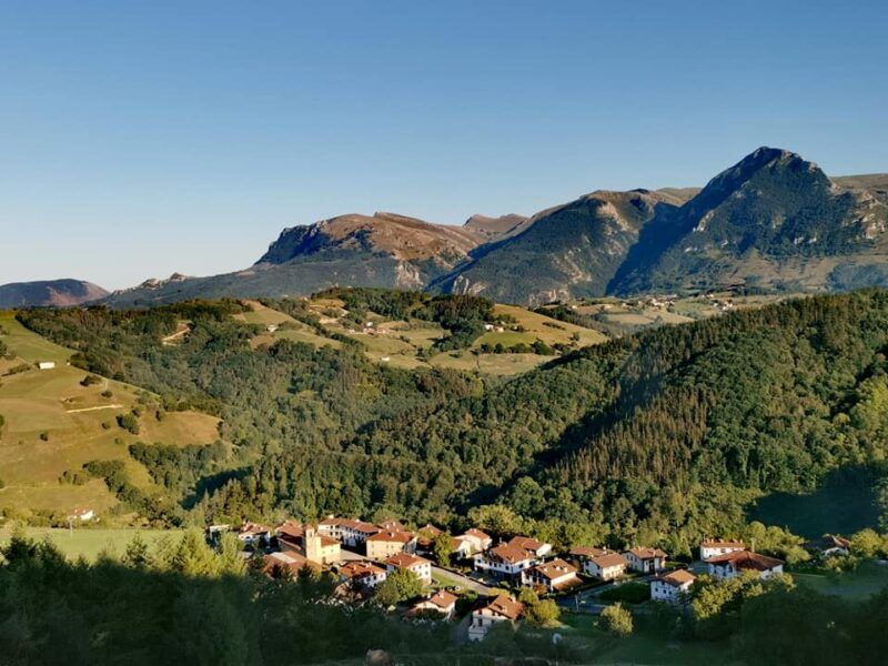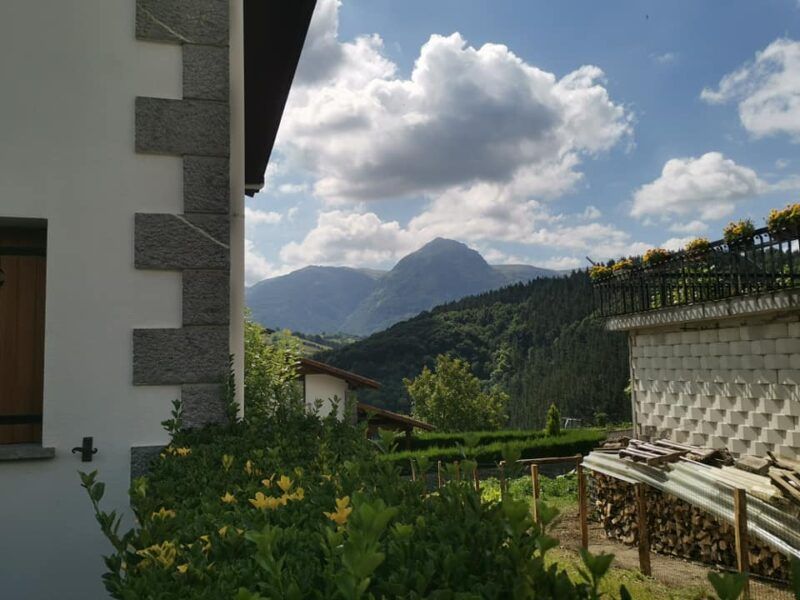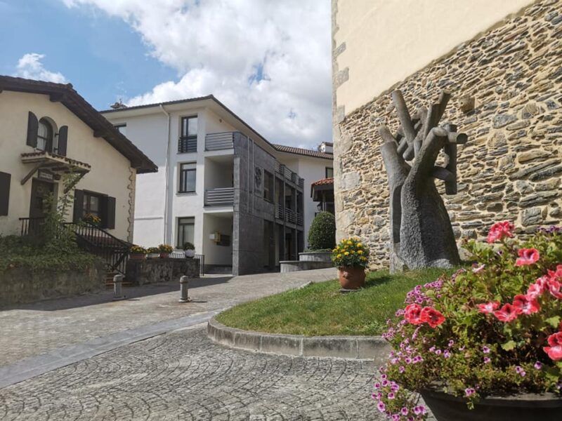 Las nubes acompañaron el juego de reflejos antes de terminar la carretera ascendente hasta el pueblo cuyas cuidadas casas invitan a tomarse la visita con mucha calma. La Iglesia de Nuestra Señora de la Asunción vigila la plaza y jardines muy pulcros. En su fachada encontramos dos relojes, uno de sol, con una placa en latín. Aquí ingresó en 1904 Joxemiel de Barandiarán para estudiar la carrera de sacerdocio.