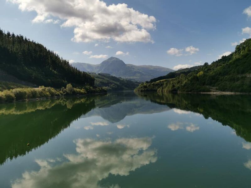 Todo reluce en un día con sol que iluminaba el entorno y sobre todo el Embalse de Ibiur que recoge las aguas del río que lleva su nombre, una gran invitación a parar y hacer jugar a la cámara y al dron a los reflejos. Un paisaje de alta montaña mientras a la espalda la carretera Nacional busca su espacio entre Legorreta, Ikaztegieta y Donosti.