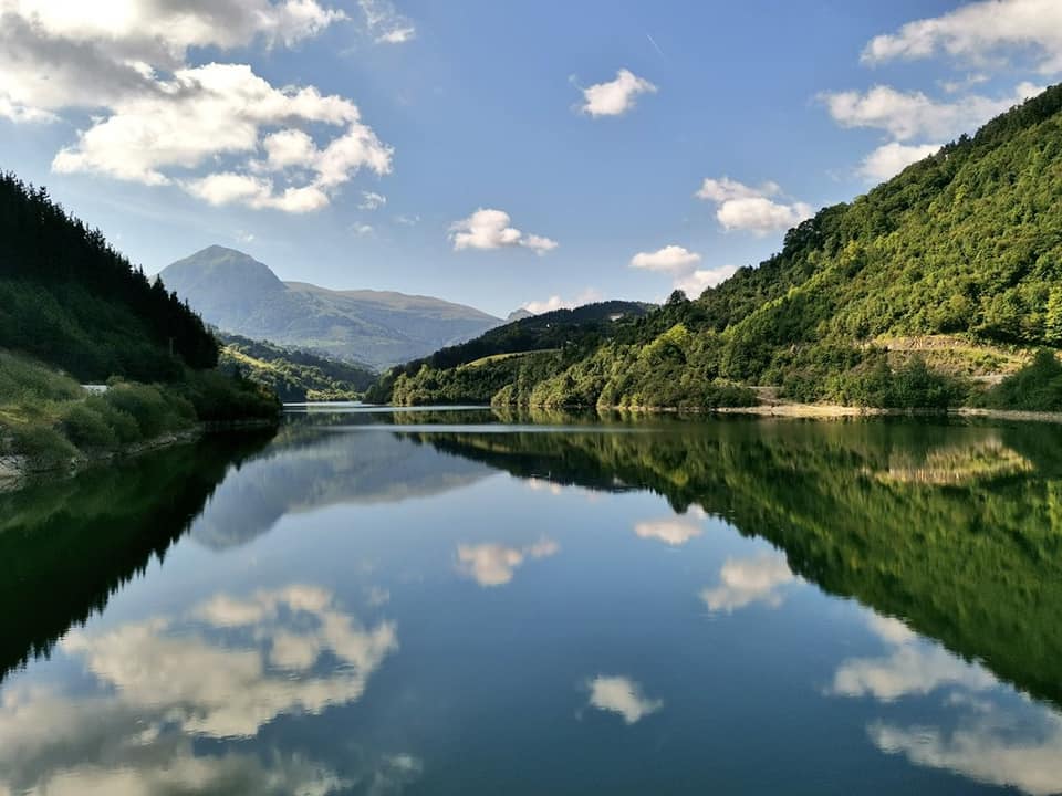 Todo reluce en un día con sol que iluminaba el entorno y sobre todo el Embalse de Ibiur que recoge las aguas del río que lleva su nombre, una gran invitación a parar y hacer jugar a la cámara y al dron a los reflejos. Un paisaje de alta montaña mientras a la espalda la carretera Nacional busca su espacio entre Legorreta, Ikaztegieta y Donosti.