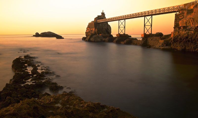 La Roca de la Virgen es posiblemente el lugar más fotografiado en Biarritz. Data de 1865 en recuerdo a la leyenda que ya hemos citado en la introducción. Queda su islote unido a tierra por un puente construido por Eiffel, llamado tanto Puente Eiffel como Puente Napoleón III. Puente y roca forman un conjunto colgado al mar de gran belleza sobre el que domina una explanada ajardinada y el Aquarium de Biarritz.