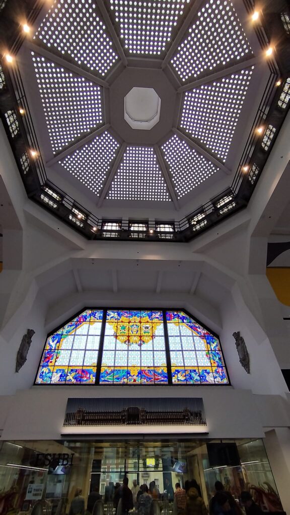Caminando, que es saludable, seguimos por la alameda Urkijo hasta el Centro Azkuna. Aprovechamos para visitarlo. Hay un pasillo donde si miramos para arriba veremos el fondo de una piscina transparente ubicada en la azotea. Curioso ver pasar las siluetas de los nadadores.