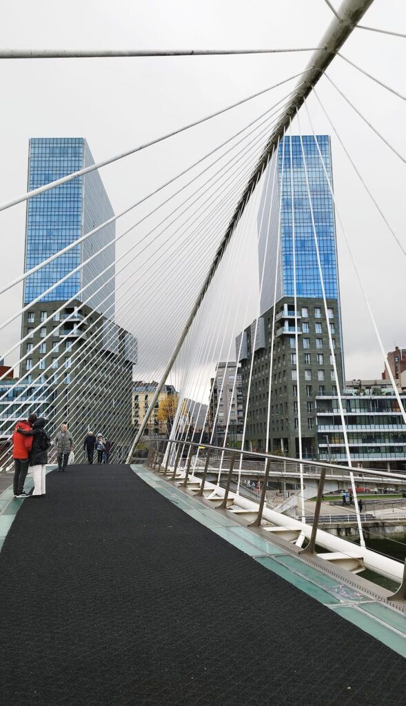 Desde el Casco Viejo hacia el Guggenheim, llama la atención el Puente Zubizuri (puente blanco en euskera) también llamado del Campo de Volantín o Puente de Calatrava. Polémico desde su creación en 1990 al resbalar su superficie de cristal y provocar más de un patinazo. Será casualidad, pero es lo primero que vimos al llegar, cosa que, por otro lado, nos vino bien para tomarnos en serio el puente.
