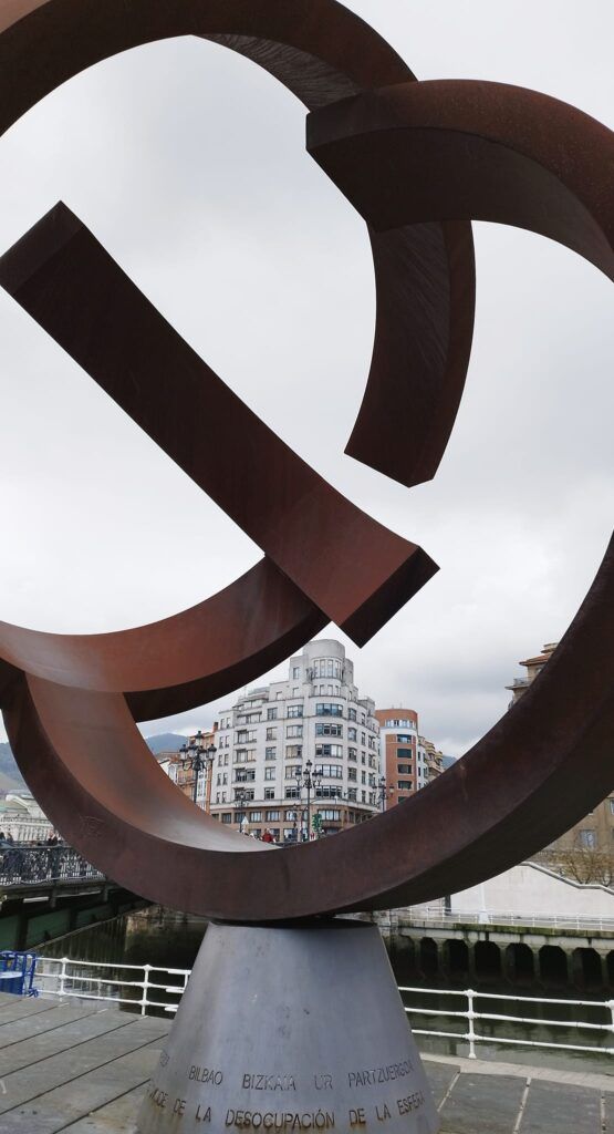 Entre los puentes y enfrente del Ayuntamiento veremos la escultura de Oteiza, «Variante Ovoide de la desocupación de la esfera», conocida como “la txapela”.
