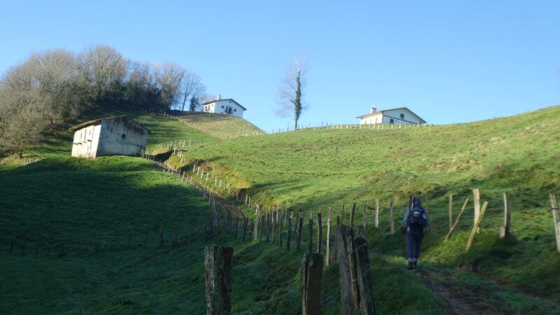 Varios caseríos en escenario campestre sorprenden al caminante, Sorozarreta, Añarre zarra (agroturismo) y Oiarzabal dan paso a un conjunto de pinos y eucaliptus y luego Bordaberi nos guía hasta el bar merendero Listorreta, puerta en este extremo del Parque natural de Aiako harria. El siguiente punto de encuentro es la popular taberna Fransilla berri y luego Fransilla zarra, con su cercana cista megalítica de nombre ” Mariola”, paso para iniciar la preciosa subida hasta la cima de Santiago Mendi ( 298 m) coronada por una importante ermita muy vinculada a la ruta Jacobea, y su adosado albergue juvenil.