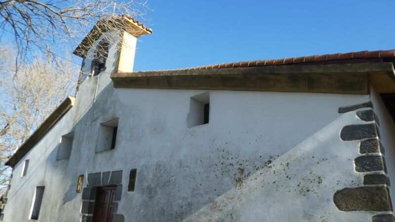 Y desde aquí toca descender en un agradable paseo cruzando caseríos, una cuidada y remozada calera y el barrio de Santiago, en la falda del monte, embrión del actual Astigarraga, con un conjunto de caseríos alrededor de su plaza etxe y su casa consistorial que mantiene un flamante escudo de armas en su fachada.