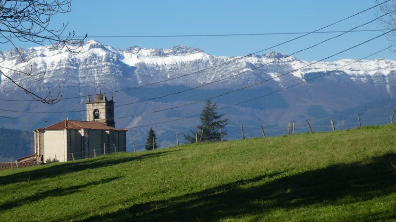 Enseguida nos toparemos con el campo de futbol , (Estadio municipal de Igartza) , y atravesando las vías de tren penetraremos sin contemplaciones en el mundo rural siguiendo un cordal balcón y belvedere sobre todas las montañas modestas del Goierri y también sobre los macizos más importantes de la orografía vasca como son Aralar y Aizkorri que durante las horas de andar serán nuestros eternos acompañantes, ofreciéndonos unas vistas de postal desde diferentes ángulos.