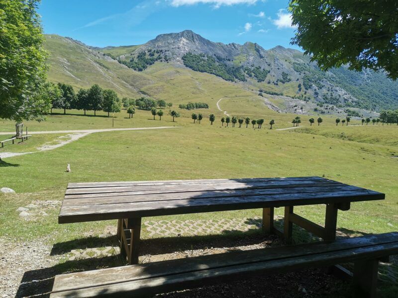 Una avenida que forman los árboles me deja en la ermita y en la famosa Benta (cerrada en el momento de mi paso) aunque siempre están los bancos y mesas para reponer. El terreno kárstico queda visible bajo las cumbres del Aketegi, Aitxuri y Aizkorri, siempre con caballos y ovejas a la vista.
