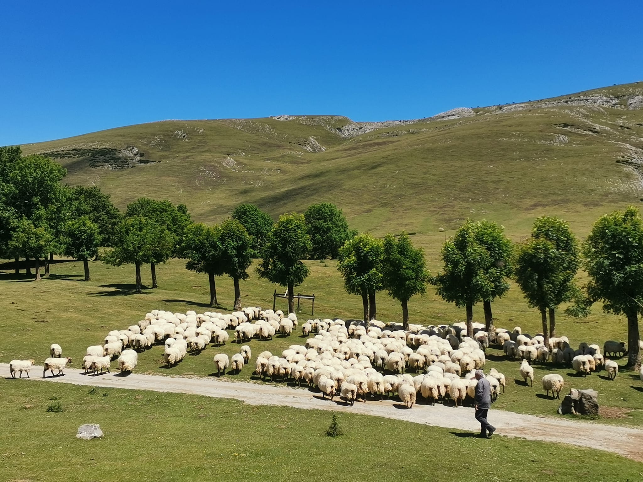 Una avenida que forman los árboles me deja en la ermita y en la famosa Benta (cerrada en el momento de mi paso) aunque siempre están los bancos y mesas para reponer. El terreno kárstico queda visible bajo las cumbres del Aketegi, Aitxuri y Aizkorri, siempre con caballos y ovejas a la vista.