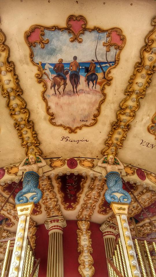 El Carrusel queda coronado por un caballito y en su parte más alta veremos en adornados marcos, pinturas con escenas de Belle Epoque y justo debajo y para desconocimiento de la mayoría y coronando la segunda planta del Tiovivo, réplicas muy bonitas de pintores impresionistas como Renoir, Monet, Degas, Van Gogh, Gauguin