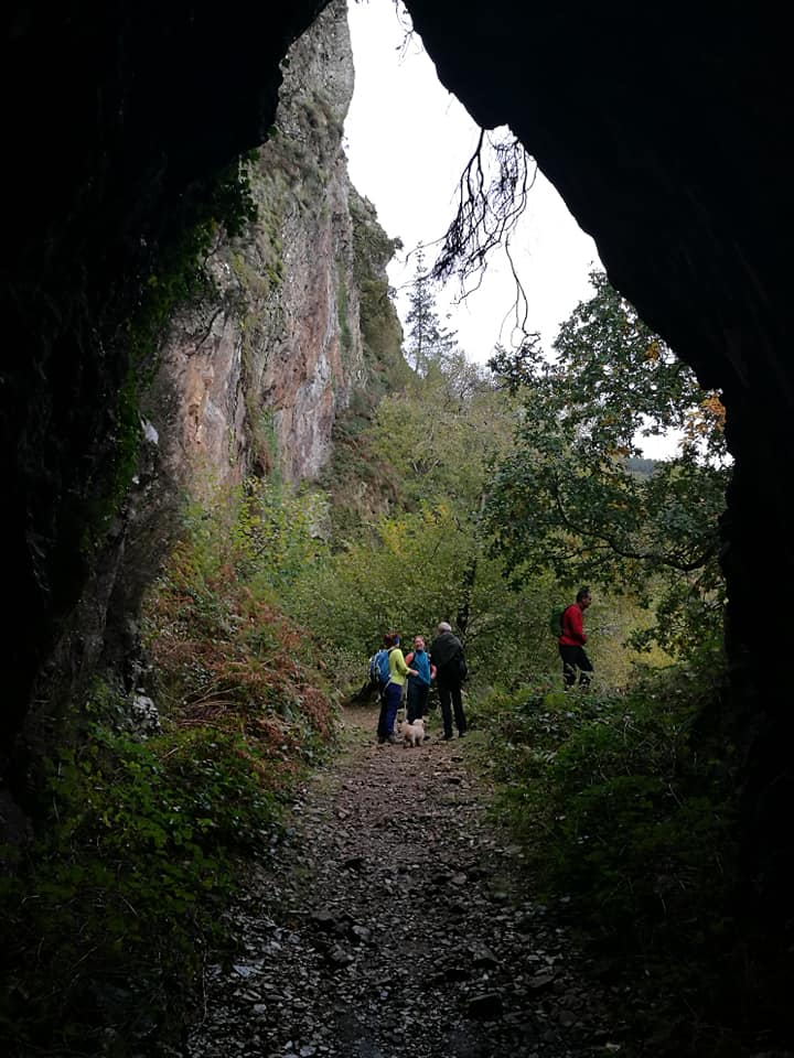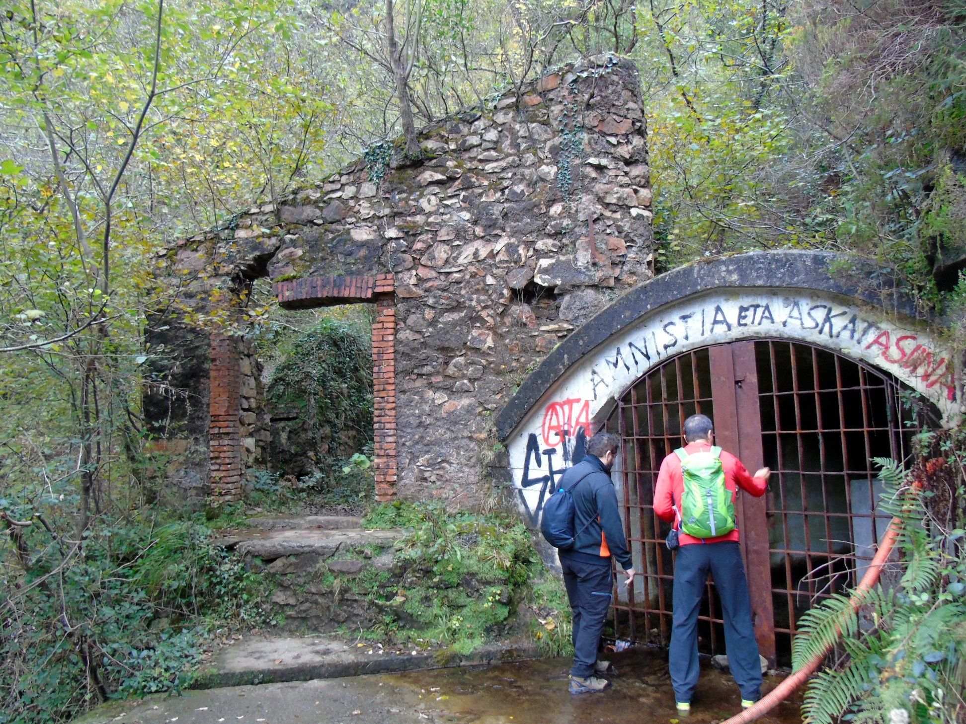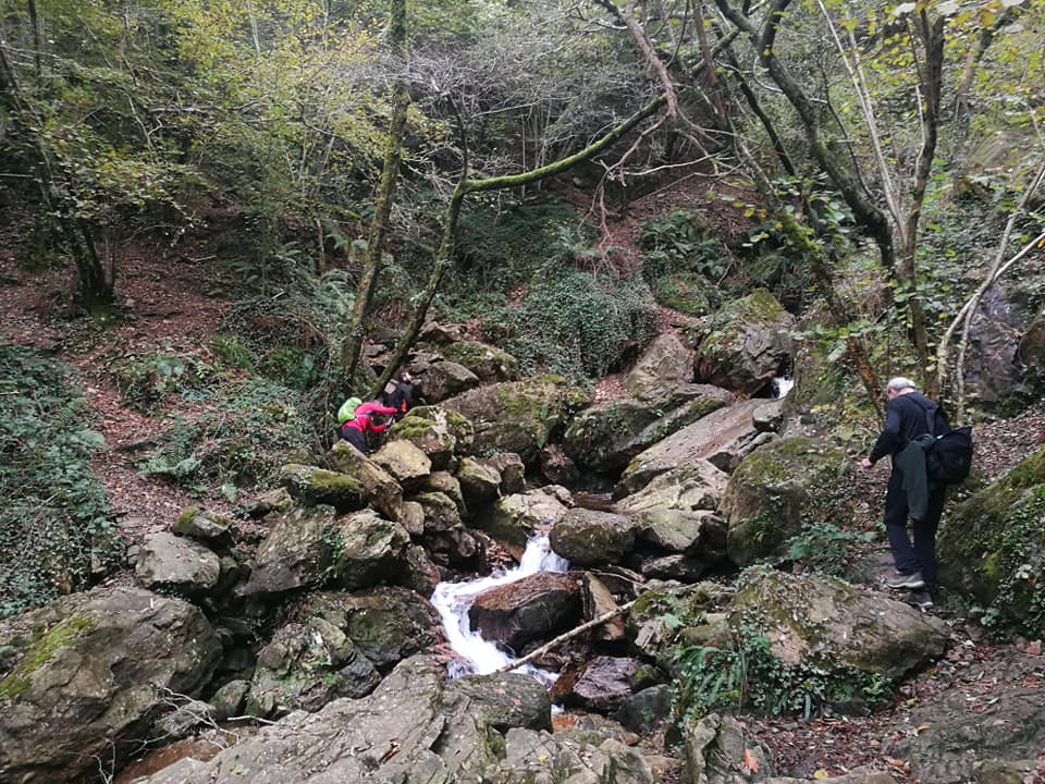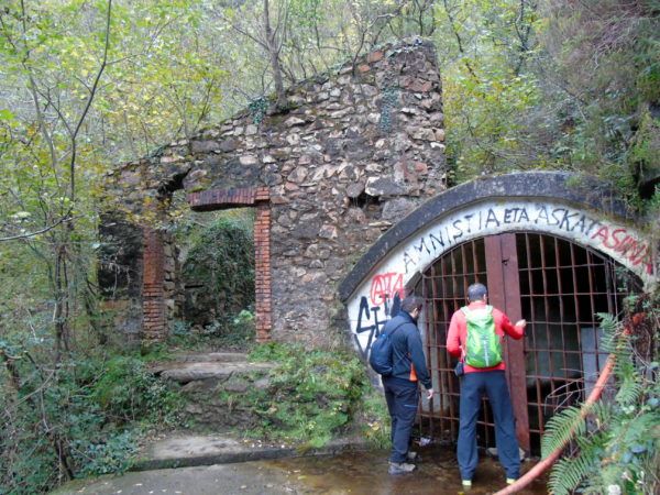 Sigue el recorrido buscando las faldas del Monte Askain hasta los restos de las minas de Meazuri disfrutando del frondoso bosque que en esta época va perdiendo hojas. Regresando por el mismo sitio y tras pasar de nuevo los túneles una empinada ladera descendente nos lleva hacia la pista señalizada de la Cascada de Irusta que tomamos hasta llegar a un sendero zigzagueante ayudado por una barandilla.
