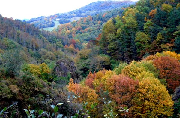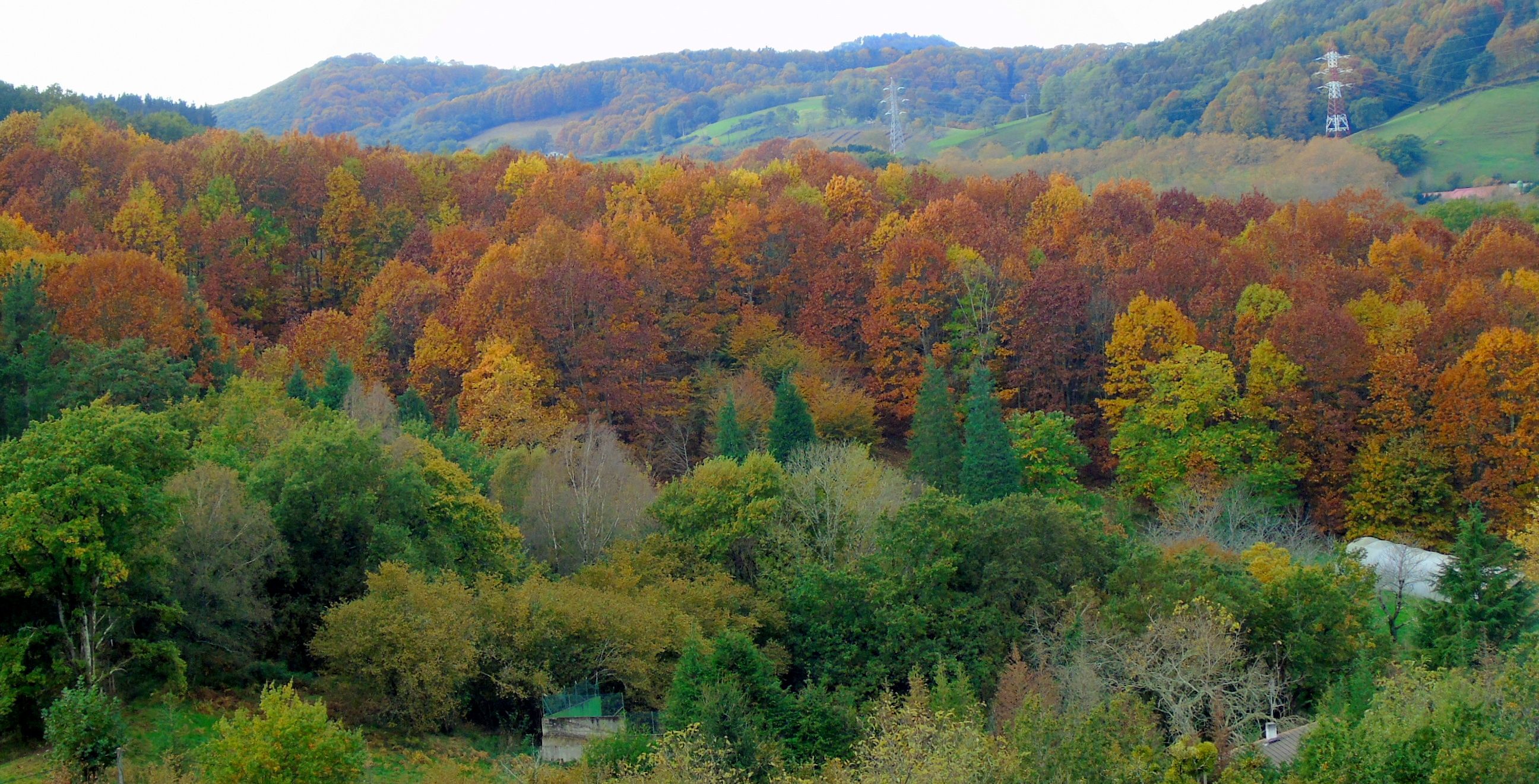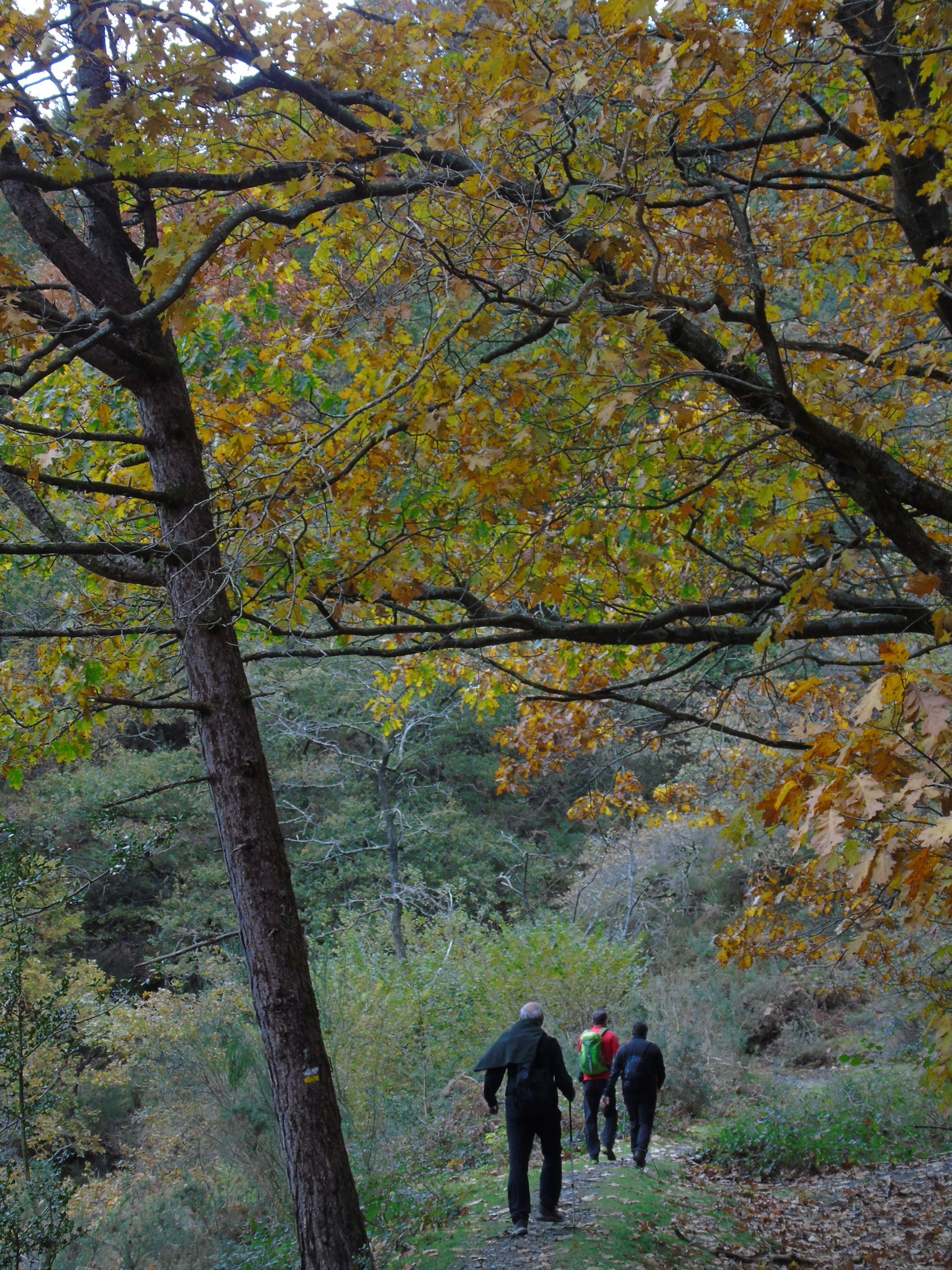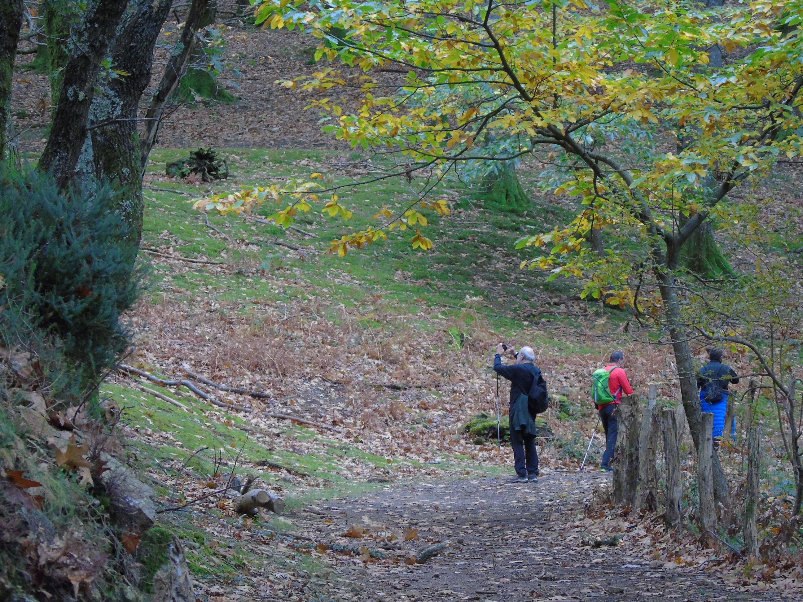 Al regreso, evitamos la zona de la barandilla tomando una pista que bordea por el oeste todo el recorrido disfrutando de los colores otoñales del bosque. Otro plus muy bello viendo por momentos la figura de la ermita de San Marcial y la bahía de Txingudi hasta llegar nuevamente a la zona de los hornos.