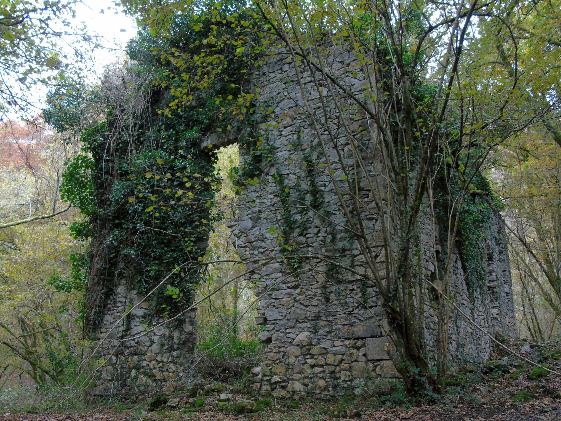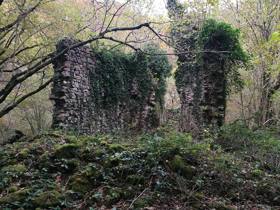 Superado este corto tramo de 40 metros de desnivel, alcanzamos el camino del antiguo caserío Irusta del que solo quedan los escasos restos de una pared, justo un poco antes de una » puerta de entrada » junto a una salida de aguas.