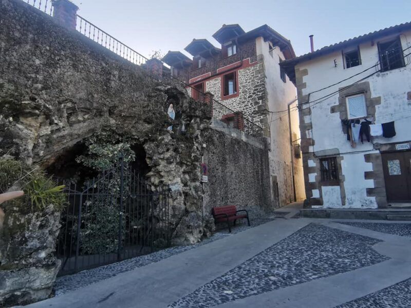 Está el excursionista en la cuesta del calvario con sus cruces numeradas que seguirá hasta la misma cima. Antes cruzará el caserío Learre, antiguo convento, donde en una cueva artificial se venera a la virgen de Lourdes.