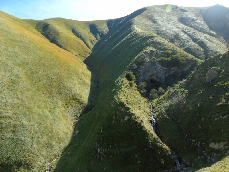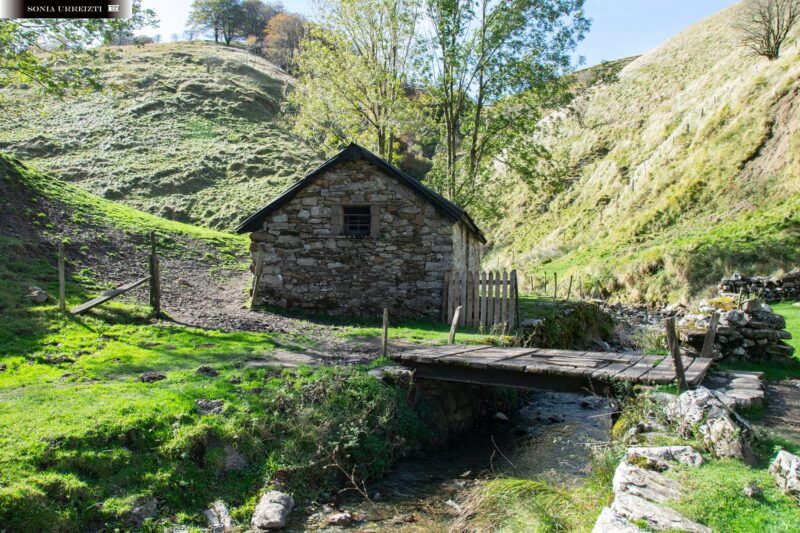 Se trata de un curioso pliegue de estratos, un puentecito, alguna txabola y rediles, cubiertos de verdes prados. La pequeña apertura del pliegue, más que una cueva, me permite entrar sin problema. Más abajo nace el río Errobi o Nive, el más importante de Iparralde.
