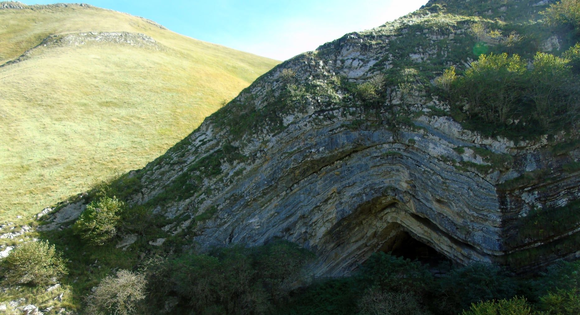 Se trata de un curioso pliegue de estratos, un puentecito, alguna txabola y rediles, cubiertos de verdes prados. La pequeña apertura del pliegue, más que una cueva, me permite entrar sin problema. Más abajo nace el río Errobi o Nive, el más importante de Iparralde.