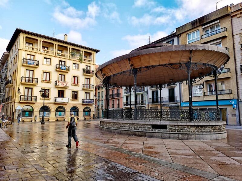 Punto de arranque en la plaza de Zarautz con su kiosko y el Ayuntamiento, dirigiendo nuestros pasos hacia la Iglesia de Santa María la Mayor. Enseguida enfrente veremos las indicaciones de Ruta del Txakoli.