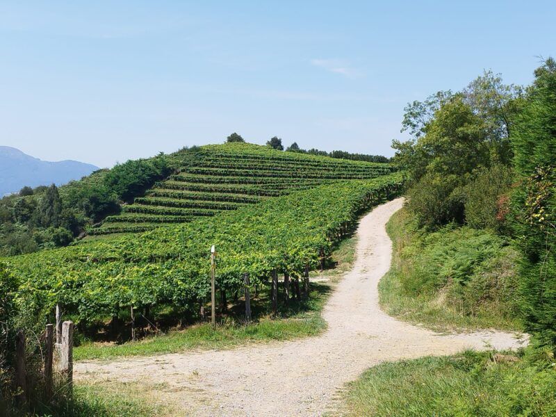 Justo en el atrio de la iglesia veré el camino que, esta vez en descenso, me lleva entre la campiña hasta la carretera que viene de Getaria. Muy posiblemente me iré cruzando con peregrinos. Enseguida a la derecha veré otra pequeña carretera que conduce al hotel Iturregi, disfrutando del paisaje de viñedos que rodea este maravilloso y tranquilo vallecito, como vemos en las siguientes fotografías.
