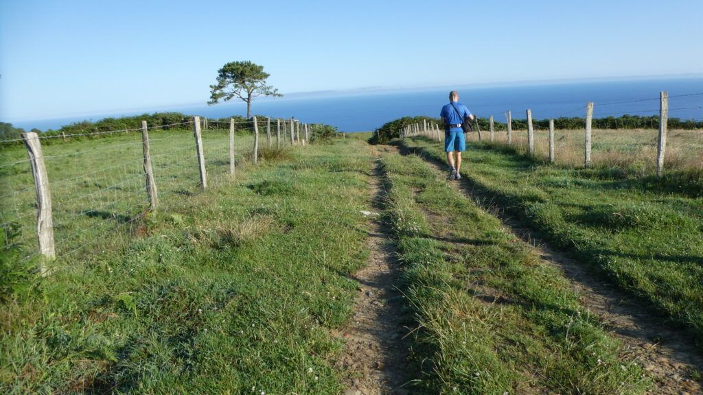 Desde el caserío parte un camino carretil directo al norte hacia el mar. Se trata de surcar las verdes lomas que delimitan los profundos valles de Sanjuanarri y Galea, que en ligero descenso se acercan hasta la cota del alto de Sanjuanarri, sobre la proa del baluarte de ese nombre que emerge del océano. Vemos en la foto el inicio del empinado descenso.