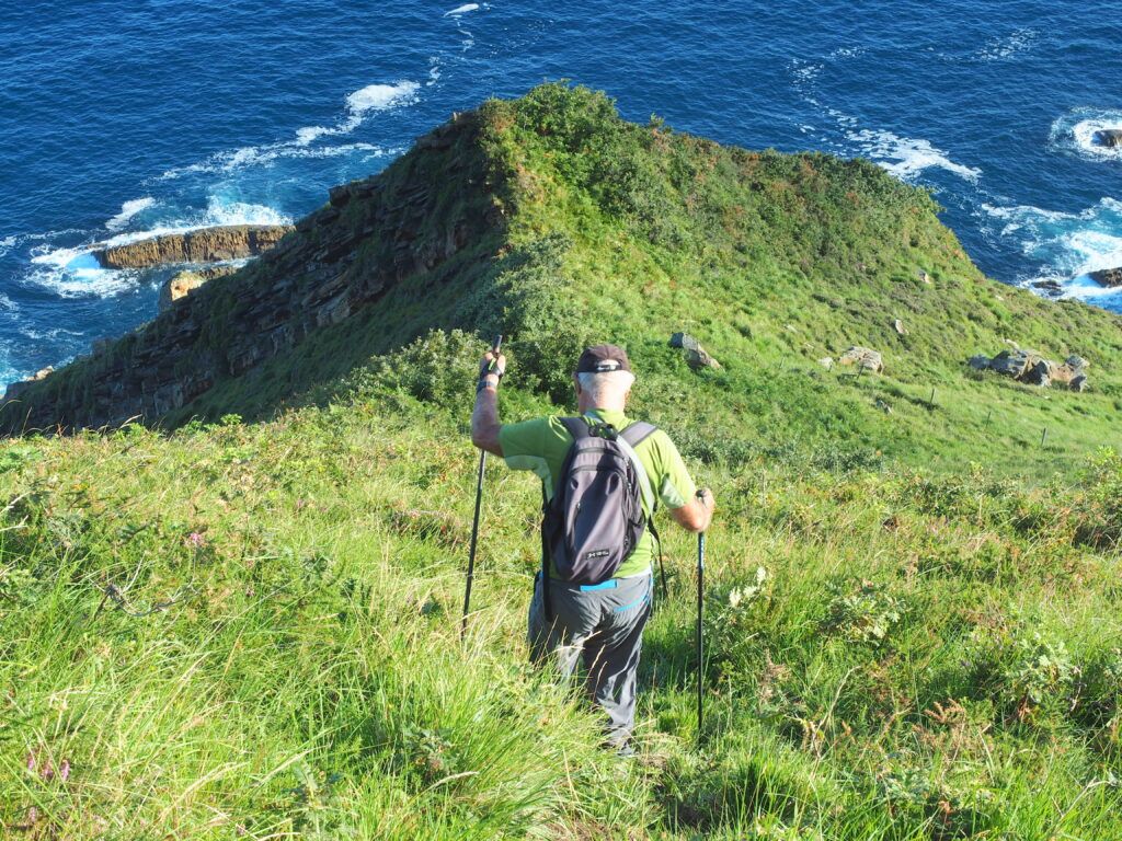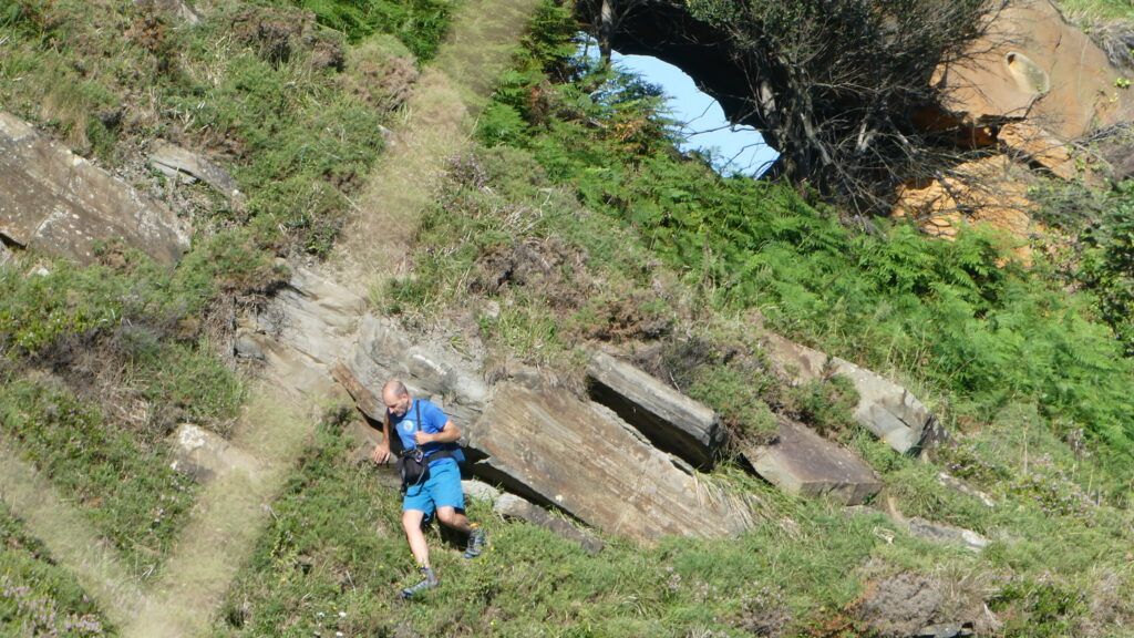 A la izquierda queda la quebrada de Gran Kanto, con su barra de exquisitas y espectaculares geoformas y a la derecha nace la de Galea, donde escondido se encuentra, sabemos, el arco o dolmen, uno de los ojos mas secretos de Jaizkibel. Para descubrirlo hay que perder altura, por una senda estrecha e indefinida (bandas blancas de orientación), paralela a la alambrada de protección para el ganado en un descenso espectacular fuerte y riguroso por su mucha inclinación, de más de 45º, que alcanza una placa de piedra vertical cercana al Cantábrico.