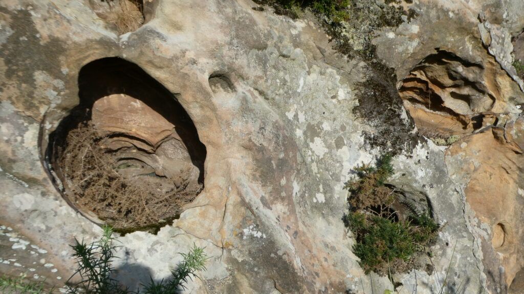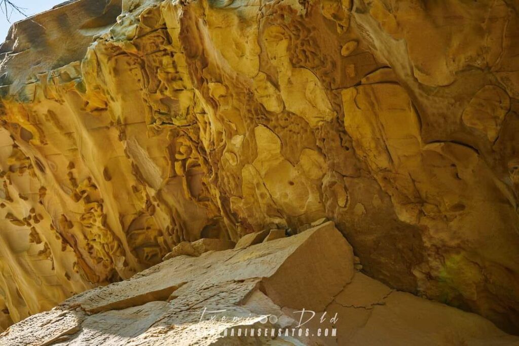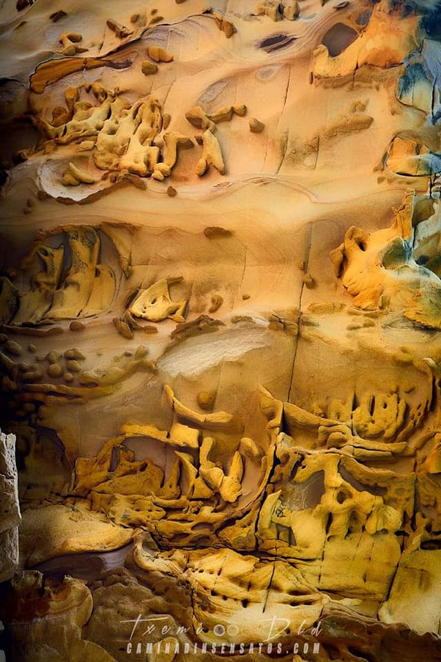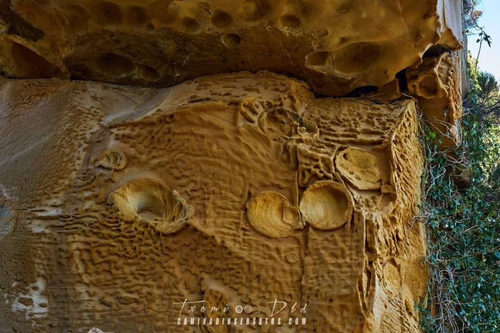 Vamos a encontrar una pequeña ventana en formación, círculos de bolas de cañón, cavidades con geoformas, cortezas y bandeados de oxido de hierro, estructuras de escape de agua y otras formas caprichosas originada por la erosión de las areniscas. Pero especialmente hay una inédita y peculiar en el mundo de la geología conocida como “piel de elefante” y única en todo este litoral.