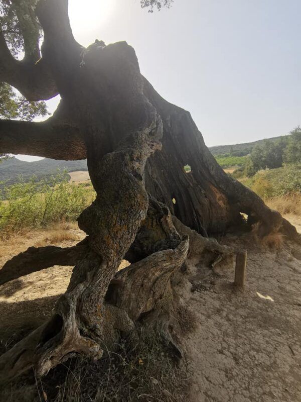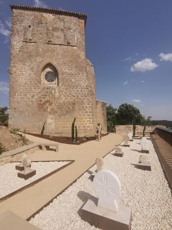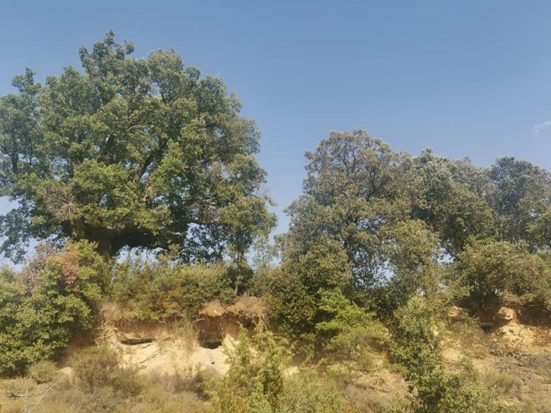 Nos queda otro secreto. Otra encina, esbelta, cercana a la famosa, situada bajo un cementerio moro. Se ven los nichos al descubierto en la pared terrosa. Un banco nos hace a la sombra de la encina disfrutar de las vistas de Eraul y el valle de Yerri.