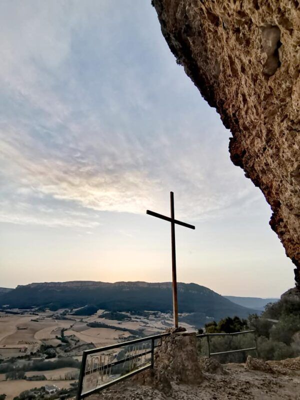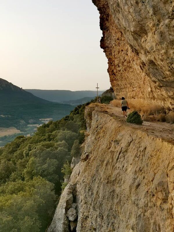 Ya bajo las paredes inmensas de un gran farallón rocoso donde se observa la porosidad de la caliza y un breve tramo de clavijas, que puede pasarse sin mayor problema aunque con el debido respeto, llegamos al mirador de Lazkua con su gran cruz.