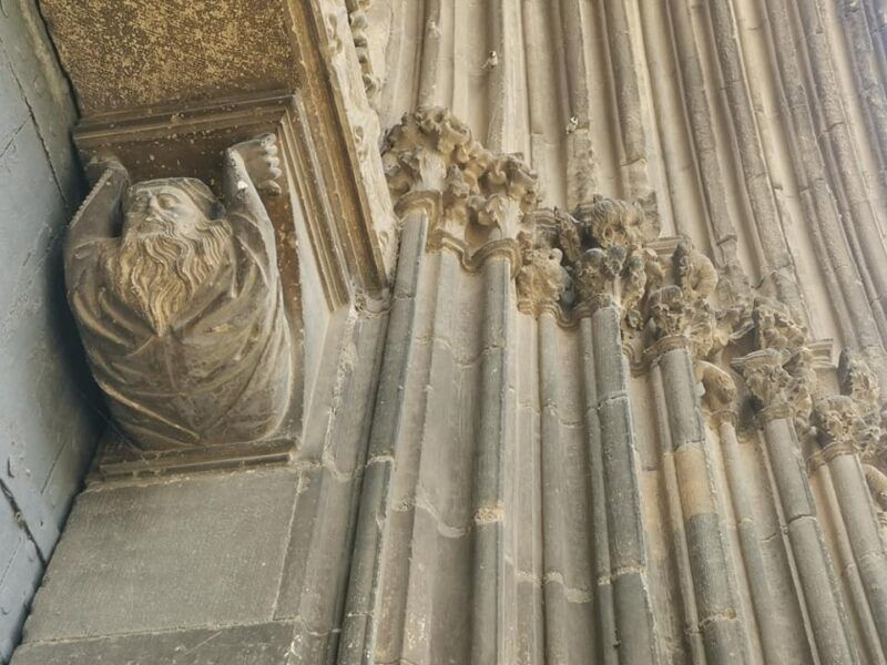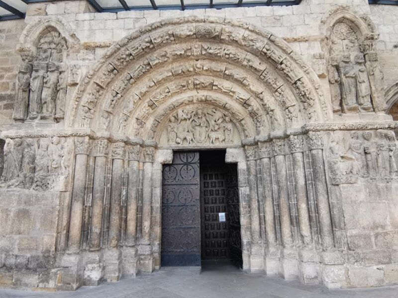 Te sorprenderá la poca precisión en los escultores de figuras religiosas pues eran canteranos en proceso de aprendizaje. Del hieratismo románico se quiso pasar a figuras más expresivas y el resultado no fue precisamente bueno. Prueba a buscar entre las paredes, el búho de la sabiduría y la ménsula que vemos en la foto pues algunos autores dicen se trata de un judío cuya aljama se encontraba cerca del templo. No parece atractiva labor sujetar de esta postura la fachada…