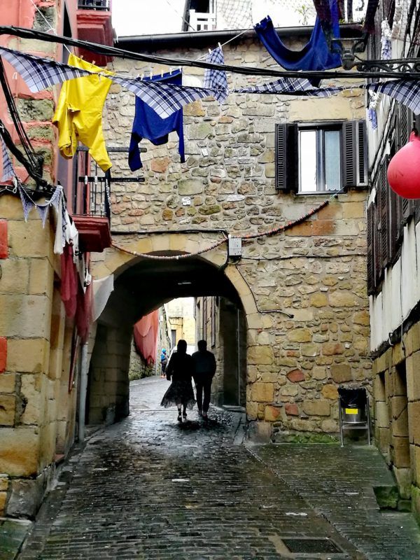 Retrocedo hacia la derecha por la calle que me lleva entre túneles cuyas paredes casi toco con los brazos extendidos hasta la Iglesia de San Juan Bautista, de una única nave de proporciones muy notables. Ahí inicio el recorrido viendo también la Casa Platain, el Palacio Arizabalo y la chimenea de la vieja fábrica de cerámica, retrocediendo hacia el embarcadero y la Plaza. Enseguida a la altura de uno de los túneles o pasadizos bajo las viviendas veré la oficina de información donde está la Casa Gaviria o de Víctor Hugo.