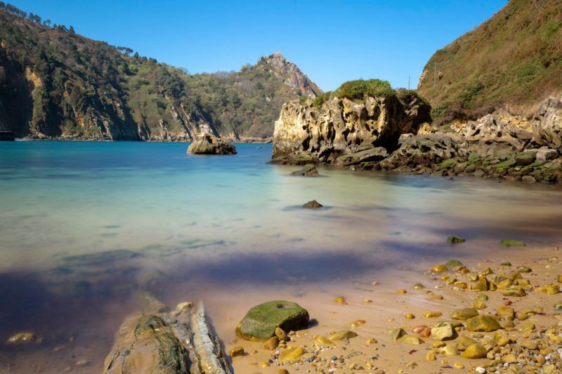 Aunque no llegaremos a ella, eso quedará para otro día, es uno de los puntos más fotografiados del camino del Faro junto a una hermosa ladera del monte. Esta cala a la que habría que bajar con cuidado presenta formaciones geológicas muy interesantes como sus “ piedras de colores “ que pueden encontrarse a puñados dando un toque muy mágico a la cala. De cualquier forma nos limitamos a verla desde arriba.