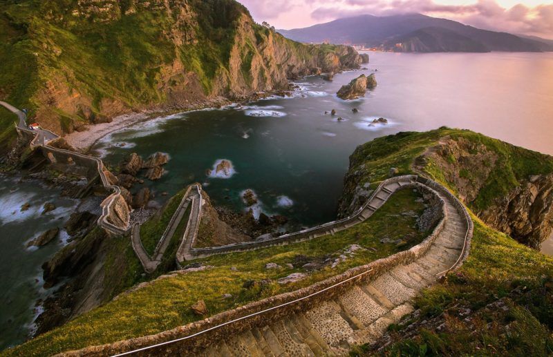 Qué tendrá toda esta costa, capaz de mover franciscanos arriba y abajo de islotes como el de Gaztelugatxe o el de Izaro, para levantar ermitas y conventos. No ven que las altas olas de los temporales, las mismas que modelan a su antojo los acantilados les pueden lanzar con violencia al abismo. La fe, la que mueve montañas, en este caso en forma de olas, piedra tras piedra, escalera a escalera, así hasta 241, un muro en mitad de otro muro infranqueable azotado por el Cantábrico.