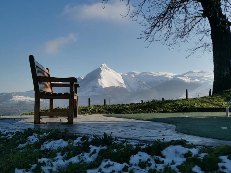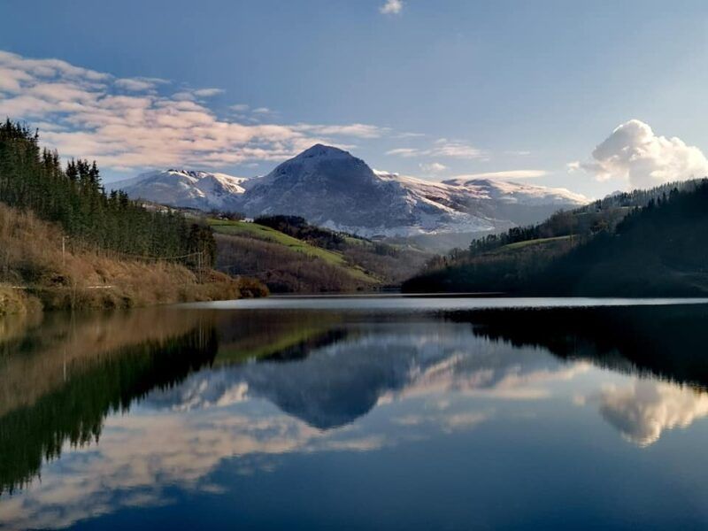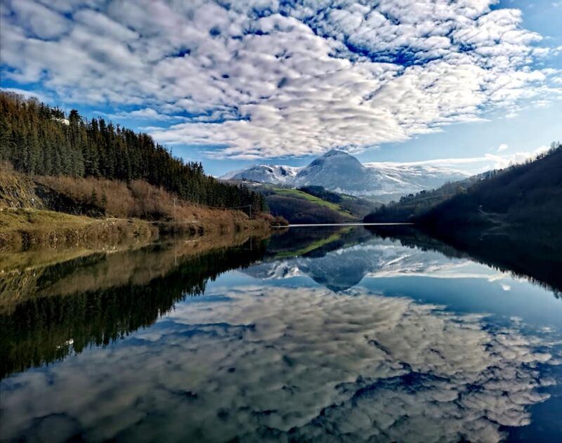 De retirada y antes de que se meta el sol entre la montaña os proponemos rematar el día subiendo al embalse de Ibiur en Baliarrain para obtener otra vista impecable de esta montaña cubierta de blanco reflejada en las aguas.