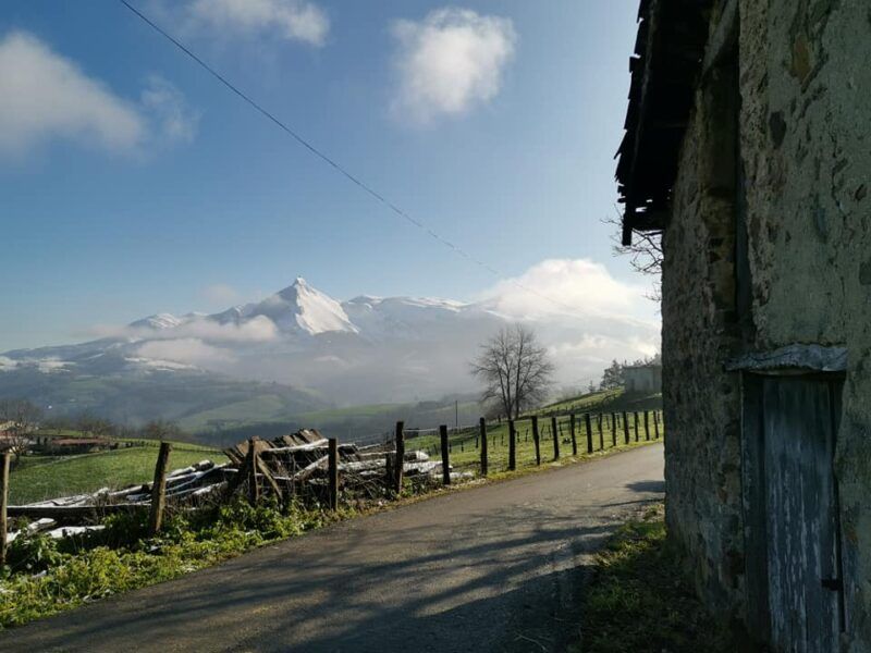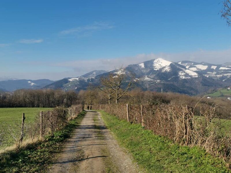 Sigo el camino y por pista asfaltada pasaré por una granja que dejo a la izquierda. Aunque un sendero marcado con las rayas blanca y roja me meterá por el bosque atajando camino, evito el posible barro siguiendo la pista de cemento hasta un cruce de pistas. Subo por la de la derecha hasta llegar a una bella zona de caseríos, prados y ya por fin las vistas del Txindoki.
