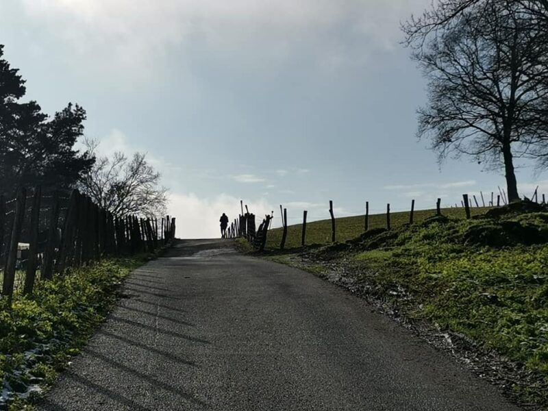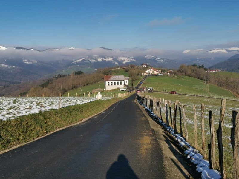 Sigo el camino y por pista asfaltada pasaré por una granja que dejo a la izquierda. Aunque un sendero marcado con las rayas blanca y roja me meterá por el bosque atajando camino, evito el posible barro siguiendo la pista de cemento hasta un cruce de pistas. Subo por la de la derecha hasta llegar a una bella zona de caseríos, prados y ya por fin las vistas del Txindoki.