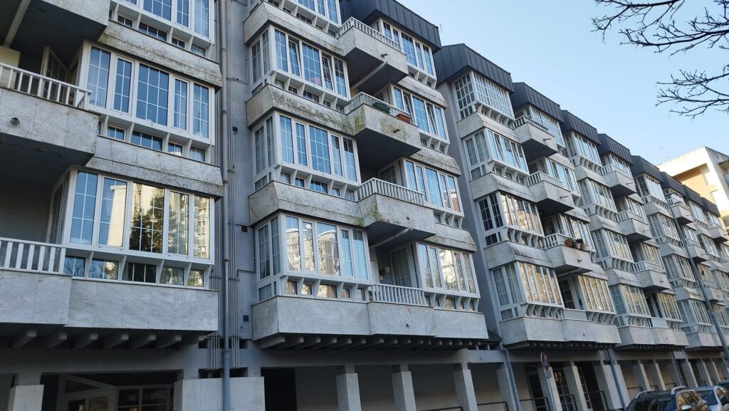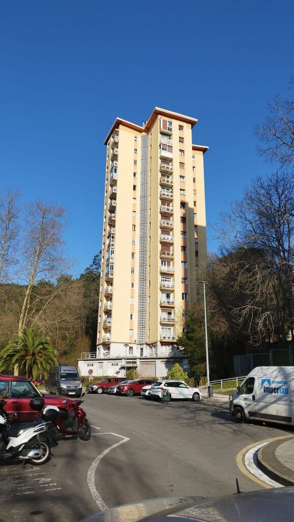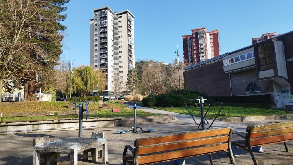 Es fácil encontrarlo dado que se sitúa frente a otra preciosa edificación de viviendas, obra de referencia del arquitecto Peña Ganchegui conocida como “la casa de los bancarios”, que rompe con el conjunto de las torres.
