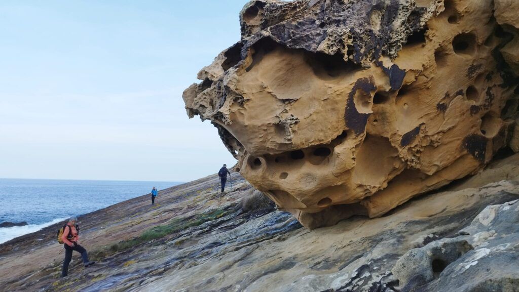Bordeamos por la izquierda el caserío y siguiendo las marcas blancas del sendero de costa (fijarse con atención), bordear por el lado este la grieta de Akerregi (que no vimos) hasta llegar a la plataforma de Tximistakurratua y disfrutar de algunas erosiones junto al mar. Obviamente, abstenerse de cruzar en temporales de mar o con la plataforma resbaladiza.