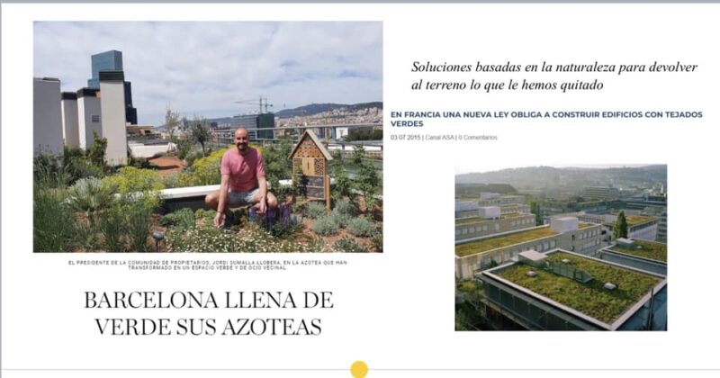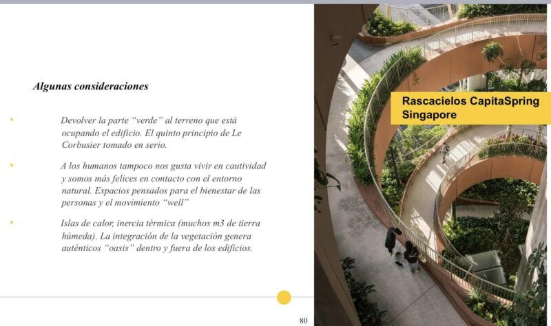 Aplicar soluciones basadas en la naturaleza, para devolver al terreno lo que le hemos quitado: tejados verdes. Barcelona llena de verde sus azoteas. A nivel de interiores también se puede incluir naturaleza como el rascacielos Capitan Springs de Singapore.