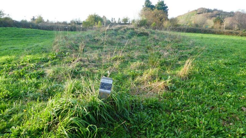 Es el siguiente monumento para buscar. Avanzando al Oeste desde Biorreta está a muy poca distancia del menhir. Un poste eléctrico de cemento es la referencia para encontrarlo. La suciedad del terreno y alambradas me impidieron llegar hasta él, visionándolo dese la cercanía. Consta de un túmulo apreciable de areniscas locales y no ha sido estudiado. Merece se limpie el terreno.
