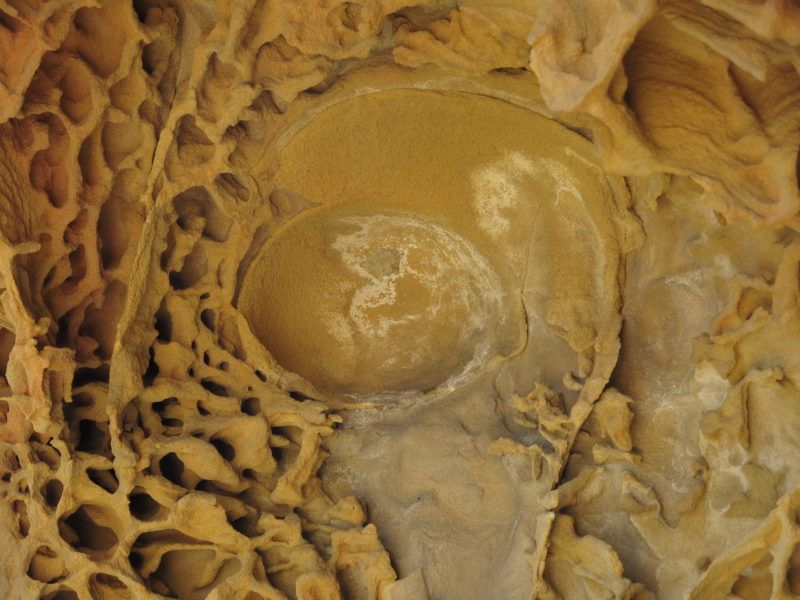 Y en su cara oriental, rodeando la formación el aficionado descubrirá una gran oquedad, que tiene todo lo imaginable e inimaginable en su interior: diversidad de aspectos y colores ( alvéolos, celdas, agujeros, tubos y arcos, hojaldres, corales y cortinajes cordados, celdas en panal de abejas…).