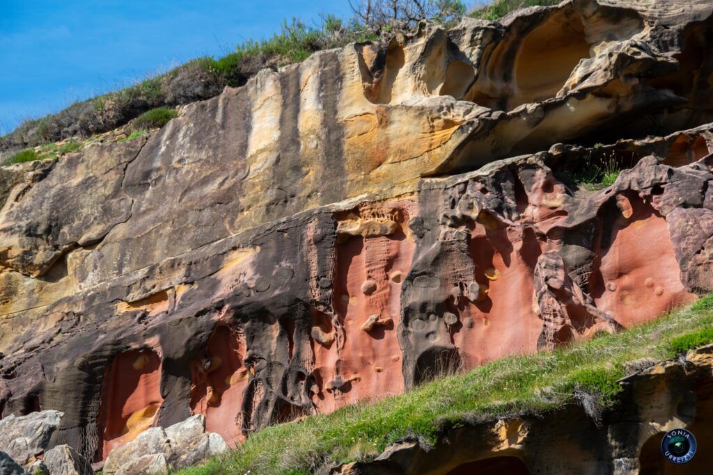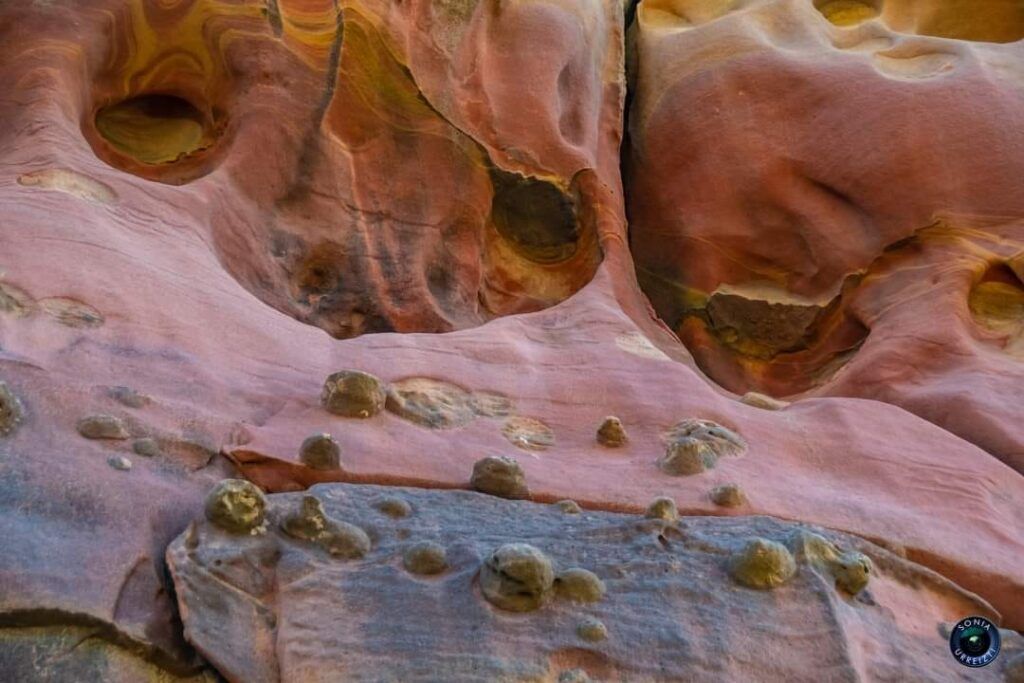 Por momentos me parece ver una gigantesca tortuga, cuyas pequeñas patas (grandes rocas de tres metros de altura) sujetan la cabeza y el caparazón. Las patas tienen rayas verticales en tonos amarillos y grises, el caparazón las tiene en rosas y rojos, salpicado de círculos amarillos que han creado un enorme planetario. De la parte superior se desparraman bandas amarillas que se pegan a la roca. Buscamos ángulos y posiciones, y en una de ellas veo una gran proa de barco con la quilla incluida.