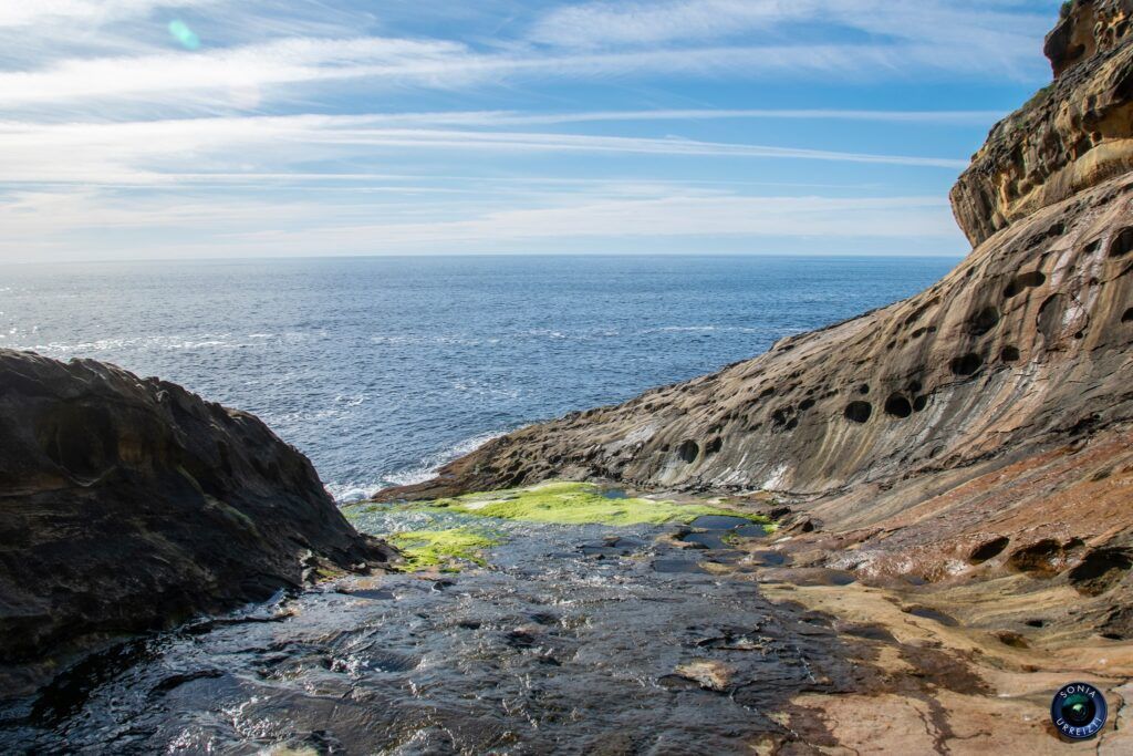 No es raro ver en este lugar, Atzein, parejas de enamorados en la puesta de sol, así como a un buen número de fotógrafos, pues las vistas de la costa son espectaculares. Bajar a Gastarrotz vuelve a ser entrar en otro mundo, y por momentos tengo la sensación de ser un astronauta explorando la luna o algún planeta sacado de un cuento. Cualquier cosa menos estar a un puñado de kilómetros de la civilización. Imaginemos un riachuelo que baja reposado sobre una plataforma más bien lisa, algo inclinada, creando pequeñas pozas y saltos.