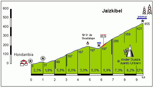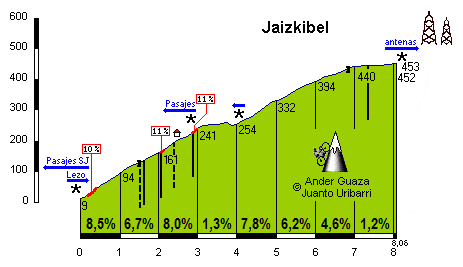 8 kilómetros de escalada con una pendiente media del 5%. Jaizkibel es leyenda por las historias que acumula y especialmente por los paisajes que ofrecen sus diferentes miradores, el mar, la costa y la montaña. La parte más dura es al principio, en los primeros kms. con pendientes al 8,2% y hasta del 10%.